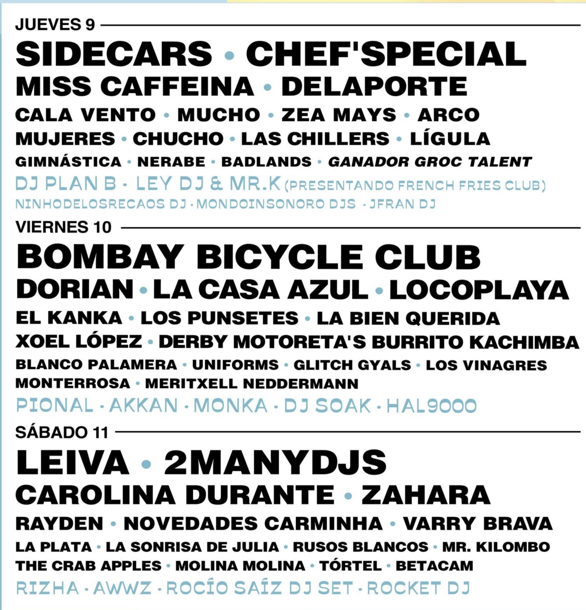 Bombay Bicycle Club, Leiva, Sidecars, Dorian, Xoel López, Zahara, Rayden, Novedades Carminha, Mucho CHEF´SPECIAL, Derby Motoreta’s Burrito Kachimba, Gimnástica, Arco, Tórtel, Chucho, Uniforms, Molina Molina, Nerabe, Badlands, Blanco Palamera, Miss Caffeina, La Casa Azul, Carolina Durante, La Bien Querida, Delaporte, Las Chillers, The Crap Apples, Los Punsetes, Varry Brava, Loco Playa, Cala Vento, Mujeres, Rusos Blancos, Glitch Gyal, Mr.Kilombo, Zea Mays, Lígula o Betacam completan el cartel de este año.