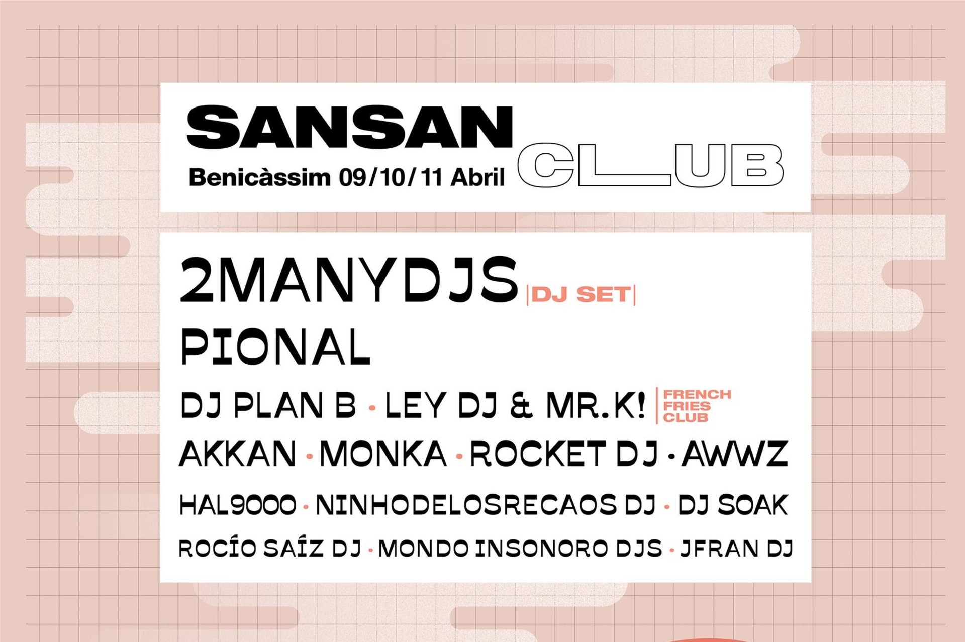 Este escenario contará con 2Manydjs, Pional, Ley DJ & Mr.K! (French Fries Club), Akkan, AWWZ, HAL9000, Plan B, Rocket DJ, Monka, Ninhodelosrecaos DJ, SOAK, Juanfran DJ, Mondo Insonoro DJs y Rocío Saiz DJ.