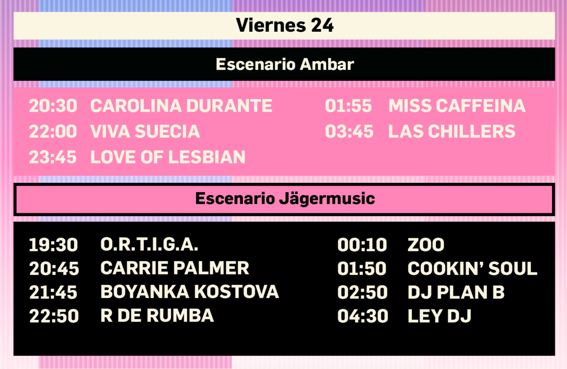 Por su parte, el Escenario Jägermusic contará el viernes con una cuidada selección de la mejor escena urbana y electrónica nacional, con directos como el de Ortiga, Boyanka Kostova, Zoo, Cookin´ Soul, Ms Nina o Putochinomaricón. Ya entrada la noche, la electrónica multidisciplinar se abrirá paso con las sesiones de DJs como Plan B, Meneo, Nat Vegas o Flash Show.