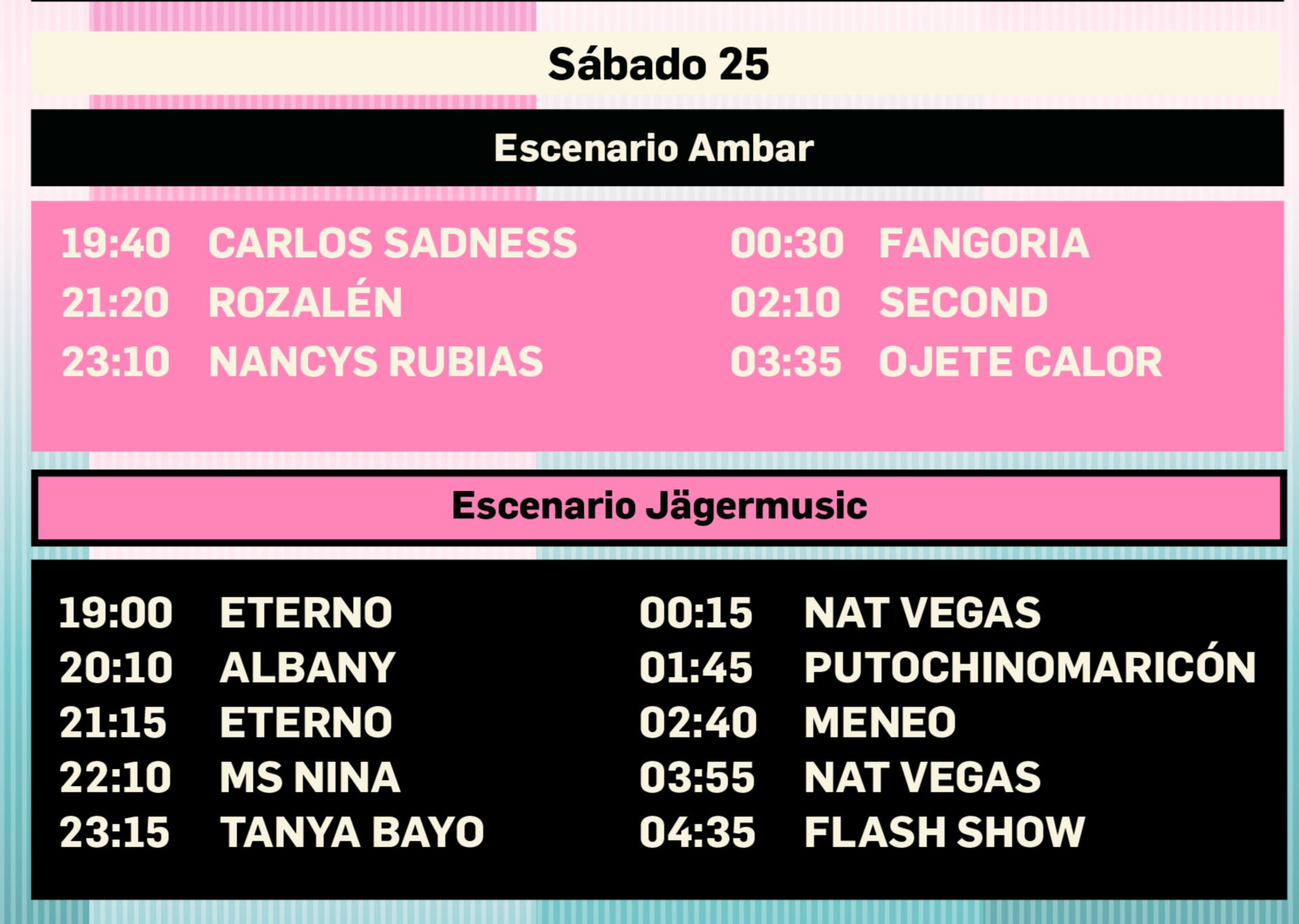 El Escenario Ambar arrancará en ambas jornadas en torno a las 20:00 horas, con actuaciones como Carlos Sadness -uno de los artistas más queridos para el público joven- o Carolina Durante -una de las bandas con mayor repercusión del momento-. La música seguirá sonando a lo largo de toda la noche con los directos de Viva Suecia -uno de los grupos más demandados por los asistentes del festival- o Rozalén -una de las mejores compositoras pop del momento- hasta, por supuesto, llegar a los cabezas de cartel: Love of Lesbian y Fangoria. Pero también habrá hueco para los bailes, la ironía y el humor gracias a los cierres de Las Chillers y Ojete Calor.