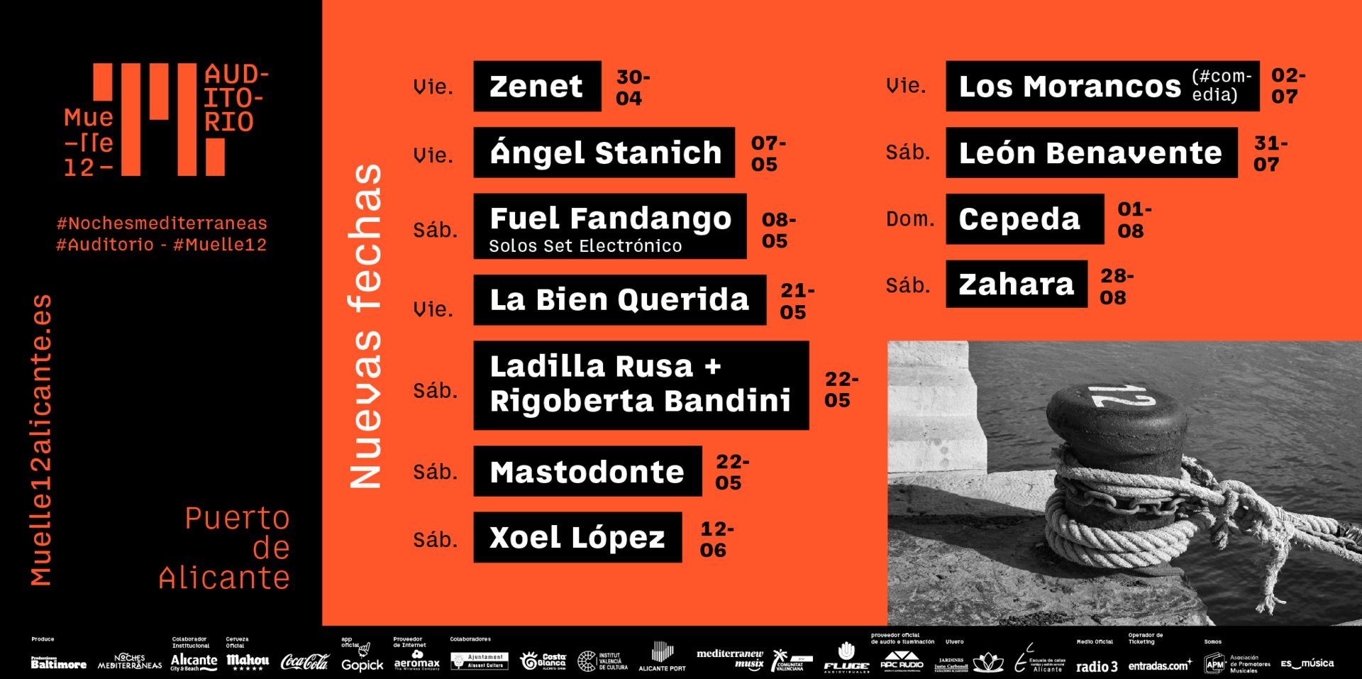 Así, a partir del mes de abril y hasta septiembre, se incorporan a Muelle 12 Zenet, Ángel Stanich, Fuel Fandango, La Bien Querida, Ladilla Rusa + Rigoberta Bandini, Mastodonte, Xoel López, Los Morancos, León Benavente, Cepeda y Zahara.