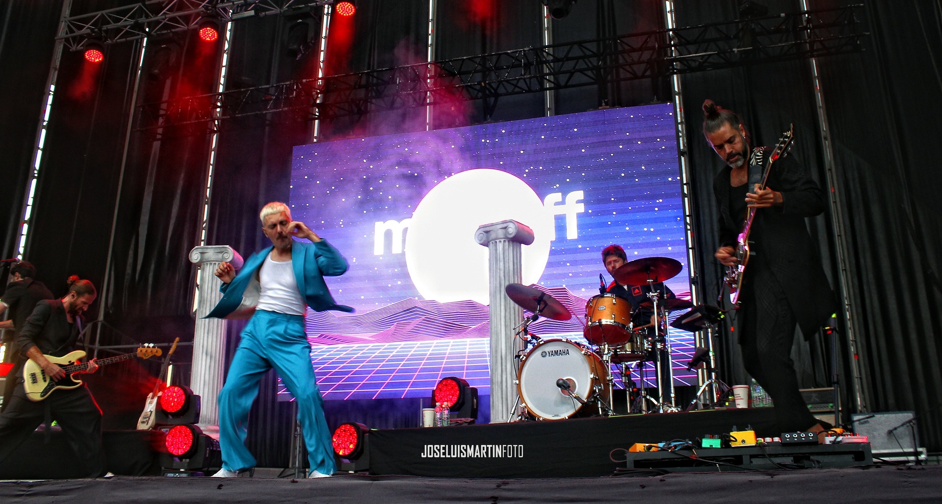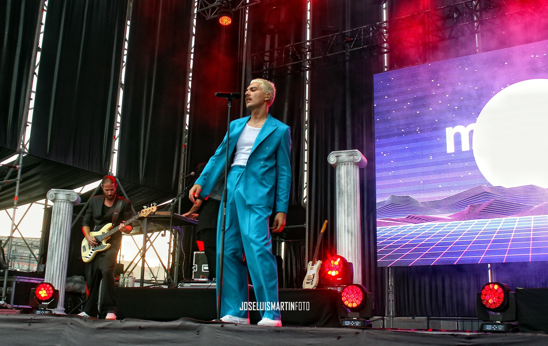 Y empieza a salir el grupo, Alberto Jiménez (voz), Sergio Sastre (teclados y guitarra), Álvaro Navarro (guitarra) y Antonio Poza (bajo), con ese nuevo look que han elegido para esta gira, y supongo que para las fotos del nuevo disco y, disculpadme, a mi no me gusta. Creo que a Alberto, en particular, ese traje azul con esa camiseta interior de tirantes no le pega nada, pero solo es opinión de un servidor.