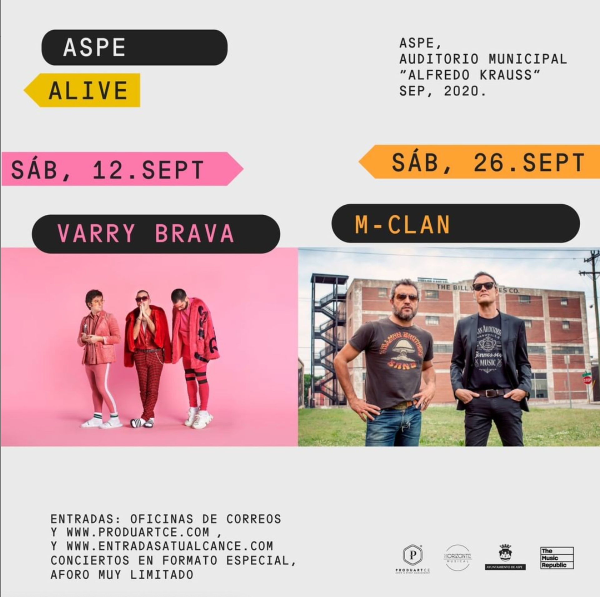 Se siguen sumando artistas al ciclo Aspe Alive. Después de conciertazos como el del El Kanka, Carolina Durante o Dani Fernaández, podremos disfrutar de Varry Brava y M Clan los días 12 y 26 de septiembre respectivamente.