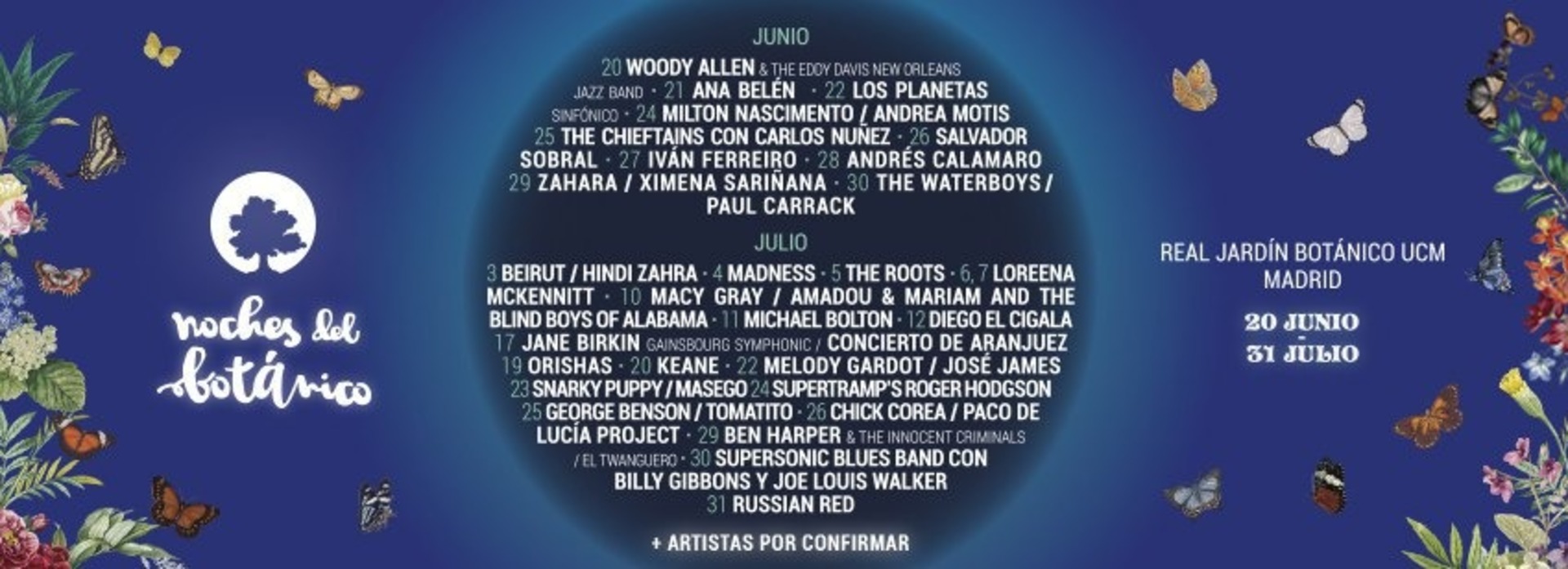 Woody Allen será el encargado de inaugurar el festival actuando junto a The Eddy Davis New Orleans Jazz Band y la española Russian Red pondrá el broche final a esta cuarta edición de Noches del Botánico. A lo largo de es mes y medio se subirán al escenario artistas como Ana Belén, Milton Nascimento, Zahara, Ivan Ferreiro, Andrés Calamaro, The Waterboys, Paul Carrack o Loreena Mckennitt, entre muchos otros.